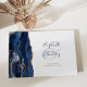 This elegant wedding guest book features a navy blue watercolor agate design trimmed with faux gold glitter. Easily customize the charcoal gray text on a white background, with the names of the bride and groom in whimsical handwriting calligraphy over a large pale blue ampersand. Add additional text of your choice to the front and spine.