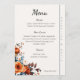 This is an elegant navy blue and burnt orange floral Wedding Menu card design with blue and orange watercolor flowers on a light orange background design. It is perfect for a summer or fall garden wedding celebration.