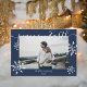Modern navy blue Christmas script snowflakes photo Holiday Card