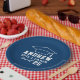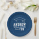 Custom round graduation paper plates features a navy blue and white design (can be modified via "Customize It!") with a graduation cap and custom text for the grad's name and class year.
