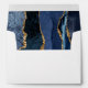 The inside of this elegant modern wedding invitation envelope features a navy blue watercolor agate geode design trimmed with faux gold glitter. Customize the back flap with the names of the bride and groom in charcoal gray handwriting script and return address in charcoal gray copperplate font.