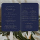 This elegant, modern wedding program fan features gold-colored text on a navy blue background. The titles and subtitles appear in beautiful handwriting script, with the remaining text in sans serif font.