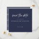 modern simple navy blue wedding save the date card with white professional text style script typography.