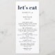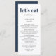 This chic modern wedding menu features a simple design with the title let's eat in a bold navy blue typography. The front features a simple font for the bride and grooms name, wedding date and menu. The reverse side is navy blue with the couples monogram. Can also be used for rehearsal dinner, engagement party, anniversary dinner.