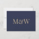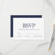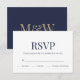 Modern Blue and White RSVP. A beautiful design featuring stylish modern navy midnight blue typography on antique gold colored front. Back features antique gold colored monogram initials on blue. Personalise with your text. Please visit our store, Austen & Grace, to view the full wedding suite, matching products and more, and please contact us if you require any assistance contact@austenandgrace.com