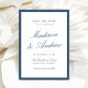 Announce your wedding with this navy photo save the date card, featuring a tailored border and a polished, formal layout. The couple’s names are showcased in elegant calligraphy script, while the wedding date, venue, and location are presented in classic serif type for a refined, balanced look. The back displays your engagement photo framed with a coordinating navy border, creating a cohesive two-sided design. Ideal for formal weddings, black tie ceremonies, classic venues, and traditional weddings, this personalized navy save the date coordinates beautifully with timeless wedding invitation suites and offers a sophisticated way to share your wedding date.