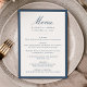This wedding menu features “Menu” in flowing navy calligraphy, with the couple’s names, wedding date, and dining selections arranged below in classic serif type. The navy border frames the layout with a crisp, tailored feel that suits traditional, coastal, and formal weddings. The structured design and rich color palette create a refined presentation for your reception courses and place settings.