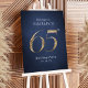 Modern minimalist 65th birthday party welcome sign features stylish faux gold glitter number 65 and your party details in classic serif font on dark navy blue background, simple and elegant.
