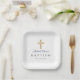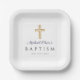 Modern Navy Script Religious Cross Boy Baptism Paper Plates