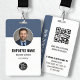 This professional employee ID badge features a clean navy blue and white design, perfect for any executive assistant. The front includes space for a photo, employee name, title, ID number, and your company logo, ensuring a polished and official look. The reverse side includes a QR code for easy access to digital information and essential return details, such as company name, address, and contact number. Its sleek design and practical layout make it an indispensable tool for workplace security and identification.