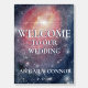 Elements: watercolor background containing galaxies stars and nebulae (nebulas?) Colors: blue, purple, pink, burgundy, plum, cranberry, mulberry, yellow, gold, & white. Themes: space, stars, universe, night, galactic, a night under the stars, written in the stars, heavenly, celestial, modern, contemporary, evening wedding, outdoor wedding. Collection: Modern Night Sky Galaxy Blue Purple Red Wedding Collection. Product Type: Welcome Sign