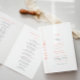 Make your wedding day uniquely yours with our customizable minimalist fun orange and white folded program. It includes a place for wedding party information, a timeline of events, order of ceremony, reception information, in loving memory, and a thank you message from the couple. This elegant program is easy to edit and have printed directly on Zazzle, allowing you to create a stylish and memorable addition to your special day!