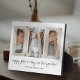 Modern father photo plaque featuring 3 family pictures for you to replace with your own, with the word "DAD" in a faded overlay, a personalized message, and the kids names.