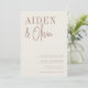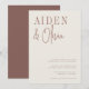 Plain white envelopes are included with paper invitations and will come to fit the invitation size you select. If you don’t need the envelopes, you may choose to not receive them by selecting the dropdown below "Envelopes" and choosing "None." If you’d like to have a design on your envelopes, you can browse all of these available envelopes to find the design that complements your Modern Pair Terracotta Typography Wedding Invitation.