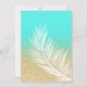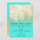 Modern simple white tropical palm tree with simple typography, a trendy and tropical wedding save the date theme with faux gold glitter tropical on palm tree leaf on aqua teal ocean.