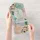 This wedding invitation card features an elegant and modern boho-chic design with a soft pastel color palette of greens, blues, and pinks. The background is adorned with watercolor-style florals, including roses and leafy foliage, creating a romantic and delicate atmosphere. The text is written in a combination of classic serif and calligraphic script fonts, adding a touch of sophistication and grace. The card includes all essential details for the event, such as the date, location, RSVP options, and meal preferences, all arranged in a circular layout that draws the eye smoothly across the design. This all in one design makes sending out invitations and rsvps much simpler. Personalize the text with your information.