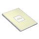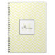 Personalized spiral notebook features pastel yellow chevron pattern with custom name in black handwriting font and monogram in matching yellow shade in white square frame.