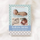 Modern baby birth announcement cards feature three photos of your sweet baby boy framed by stylish quatrefoil and polka dot patterns. White, jade green, cloud blue, and soft pewter gray color scheme.