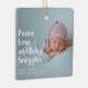 Celebrate your little one’s first Christmas with this sweet photo ornament featuring a peaceful sleeping baby wrapped in soft blue tones. Perfect for commemorating your baby girl or boy’s first holiday season, this personalized Christmas ornament brings warmth and joy to your festive decor. Add your child’s name and year for a keepsake that will be treasured for years. Create yours today.