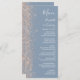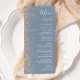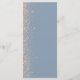 The left-hand edge of this elegant modern wedding menu features a peach faux glitter design. The customizable text combines white handwriting, copperplate and italic fonts on a dusty blue background. The reverse side features a matching dusty blue and peach glitter design.