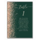 The left-hand edge of this elegant modern wedding table number card features a peach faux glitter border. The word "table" appears in pale peach whimsical handwriting script on a dark emerald green background. Add the names of your guests who are assigned to each table.