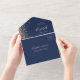 The left-hand edge of this elegant modern all-in-one wedding invitation and RSVP features a peach faux glitter border. The customizable text combines peach whimsical handwriting, copperplate and italic fonts on a navy blue background. The return address appears on the outside flap and the reverse side of the detachable RSVP card in peach text on solid navy blue.
