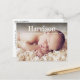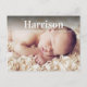 Easily share your happy news with this bold birth announcement postcard. The front of the postcard features a large photo of your newborn. A white text overlay at the top of the design includes your new baby's name written in bold lettering. Below, you can add your baby's full name and birth date. This design works best with photos that have a darker background so that the white text can really shine. On the back of the postcard, you'll find room to write a longer custom message to recipients.