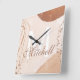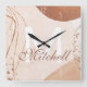 Beautiful, unique, one-of-a-kind personalized clock features a cream, brown and gold abstract design with your own personalized last name in a script font overlay design and the last name monogram initial in a bold font. Personalize this clock by adding your own personal information. Makes a great wedding, anniversary, or housewarming gift. Click "personalize this template" to change the names, fonts, and colors to create a unique one-of-a-kind design. What an elegant accessory for your living room, bedroom, or family room. If you need any help with customization please email me at ybnormalone @gmail.com. Thanks for stopping by www.zazzle.com/Personal_Creations. ©Karen Hall for Personal_Creations at Zazzle.