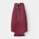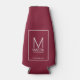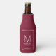 This bottle cooler features personalized groomsman's monogram and name with title and wedding date in white modern sans serif font style on burgundy red background.