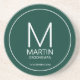 This coaster features personalized groomsman's monogram and name with title and wedding date in white modern sans serif font style on emerald green background.