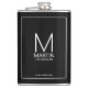 This flask features personalized groomsman's monogram and name with title and wedding date in white modern sans serif font style on black background.