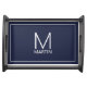 Modern minimalist design features personalized monogram and name in white modern sans serif font style on navy blue background.