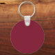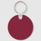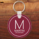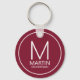 This keychain features personalized groomsman's monogram and name with title in white modern sans serif font style on burgundy red background.