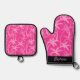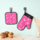 This oven mitt set features a tropical design with palm trees on a hot pink background. Personalize it with a name.