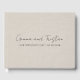 A modern minimalist wedding guest book with handwritten style script typography on a faux linen silver gray background.