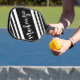 Modern personalized custom color pickleball paddle featuring a name (or monogram) shown in an editable hand-lettered script typography and changable white sporty stripes against an editable black background so you can create a custom design for the pickler or pickleball enthusiast. COLOR CHANGES: Change the text, stripe and/or background colors or add a styled graphics background by clicking on the EDIT tab in the PERSONALIZE section. PADDLE OPTIONS: Choose from Black, Tan or White edging and grip colors on the ordering page. ASSISTANCE: For help with design modification or personalization, color change, resizing, transferring the design to another product or if you would like coordinating items, contact the designer BEFORE ORDERING via the Zazzle Chat MESSAGE tab below or email makeitaboutyoustore@gmail.com.