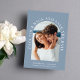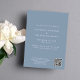 Modern dusty blue destination wedding save the date card featuring your photo in an arch frame and "Pack Your Bags And Save The Date" in elegant white text. Under your photo, add your first names, wedding date and location. On the reverse side, personalize the save the date details in simple typography and input your wedding website URL address to create a scannable QR code for your guests to easily visit your website.