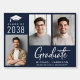 Modern blue graduation party foam board welcome sign featuring 3 photos and "Graduate" in a bold contemporary white script. Add the grad's name, class year and school in simple white lettering.