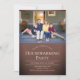 A housewarming invitation with customizable text. The photo is a template and meant to be swapped out for your own. The invitation has a brown background and white text.