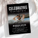 A modern celebration of life funeral announcement featuring big bold text with a fusion of calligraphy typography, a photograph of your loved one blended in with the background with the use of overlays and a simple memorial template that is easy to customize with your own details.