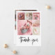 Modern, elegant photo collage card to announce your baby's birth, featuring 6 photos of the baby on the front and typography script 'thank you'' in trendy handwritten lettering. Personalize further with another photo on the back, your thank you message, baby's name and birth stats.