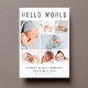 An elegant birth announcement to introduce your newborn baby to friends and family featuring "Hello World" in large lettering, a 7 photo collage and their name, birth date and birth stats in simple modern typography. On the back, add an additional photo and your personalized message.