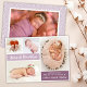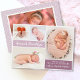 Modern, Girly Lilac and Mauve Baby Birth Announcement 4 Photo Collage Cards. Elegant, cute 2-sided photo birth announcement template card featuring four (4) of your favorite baby photos on front, with a pretty hand lettered script in white on pastel lilac or light purple and mauve or dusty plum purple color blocks. Add your baby's name on the front and birth stats. On the back side there's one horizontal baby photo on blush pink white dotted background. You can easily personalize it.