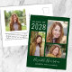 Modern dark green graduation announcement postcard for her with a 3 picture photo collage on the front. Add her name in a stylish trendy white script and her class year and school or university in modern white typography. On the reverse side, add an additional photo and a custom message.