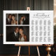 Elegant wedding seating chart featuring a simple design with a photo collage of 3 photos. Just edit the tables and names. Available in printed format on foam board