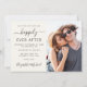 Modern light cream wedding save the date announcement featuring your photo and "Happily Ever After" in a mix of simple typography and a chic swash script. Personalize your save the date details and add your names in a signature-like script. On the back, your names and wedding date are joined together by a heart.
