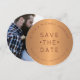 Classy glamurous simple trendy typography wedding save the date photo round card with two little hearts on a copper metallic glitter background. ++++++++++++++++ Easy to personalize with your text and image on both sides! +++++++++++++++ Ideal for stylish formal glam weddings. Recommended mostly for winter or Christmas events.