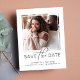 Simple save the date announcement postcard that features your photo with a square frame cut out and minimal modern typography with a touch of an elegant script. Personalize with your first names, wedding date and location. On the reverse, customize your save the date details and add your names in a signature-like script.