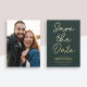 Real gold foil save the date with a dark green background on the front and a photo on the back.