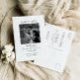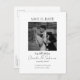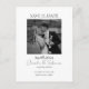 These modern and elegant wedding save the date postcards feature black script font text on a simple classic white background. The front of the postcard features 'Save the Date' in a handwritten calligraphy font with editable text boxes to add your wedding date, names, wedding location and space for your favorite couple photograph. The back of the postcard includes lines for you to write the recipients address and add a stamp to post to all your guests.